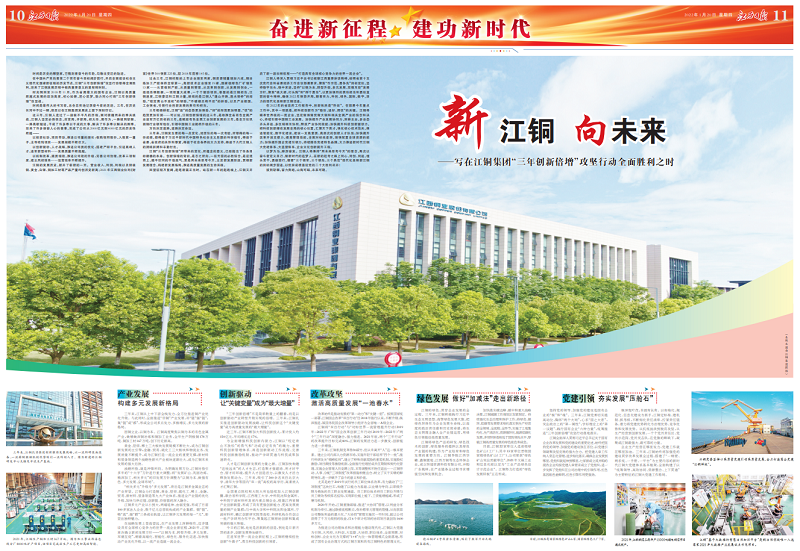 1月20日,《江西日?qǐng)?bào)》刊發(fā)連版報(bào)道《新江銅 向未來(lái)——寫(xiě)在江銅集團(tuán)“三年創(chuàng)新倍增”攻堅(jiān)行動(dòng)全面勝利之時(shí)》,報(bào)道江銅“三年創(chuàng)新倍增”攻堅(jiān)行動(dòng)取得全面勝利,并介紹了三年來(lái)江銅各方面所取得的亮點(diǎn)。