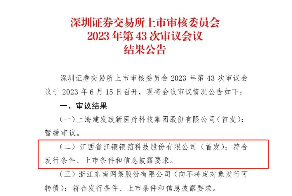 6月15日,深圳證券交易所上市審核委員會2023年第43次審議會議召開,江西省江銅銅箔科技股份有限公司(首發(fā)):符合發(fā)行條件、上市條件和信息披露要求,成功過會。