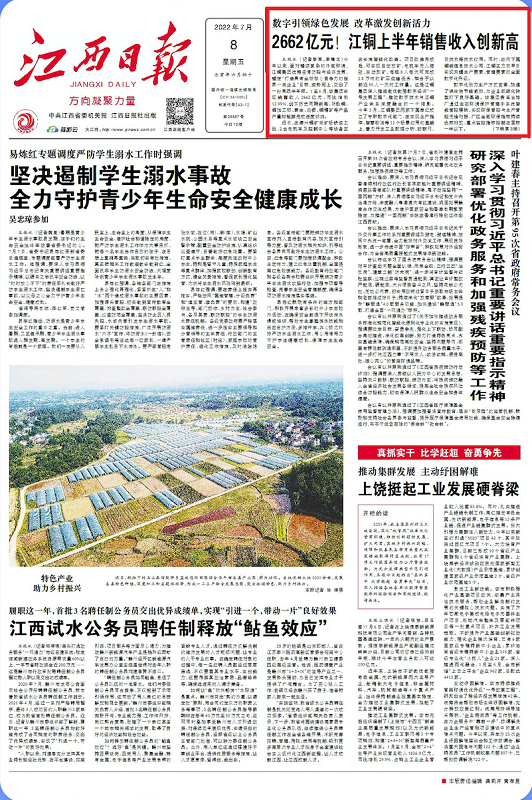 7月8日,《江西日報》頭版報眼位置發(fā)布報道《數(shù)字引領(lǐng)綠色發(fā)展 改革激發(fā)創(chuàng)新活力 2662億元!江銅上半年銷售收入創(chuàng)新高》,介紹了江銅集團(tuán)上半年的亮眼成績。江西新聞客戶端同步推送該報道,客戶端瀏覽量超10萬。